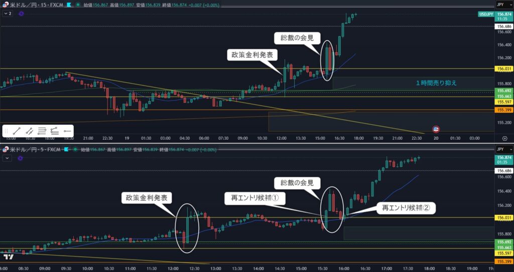 再エントリ候補②5分ですら波を作らずの上下なので、リターンムーブで覚悟を決めて入るしかない