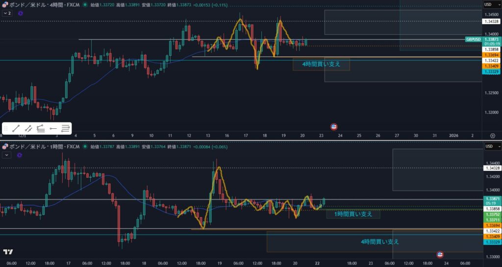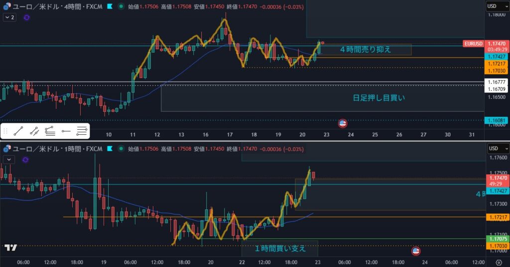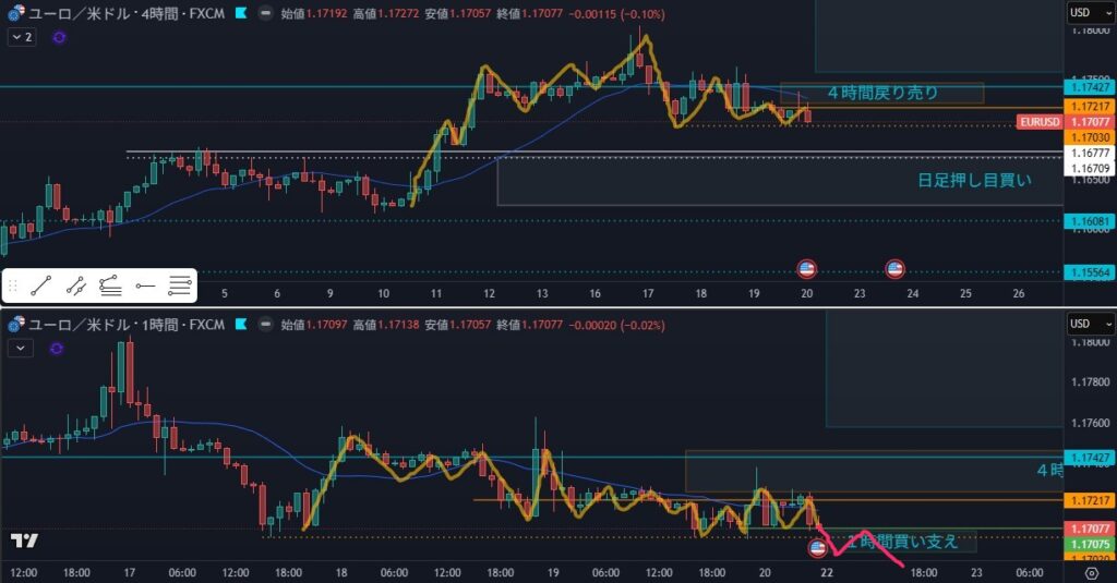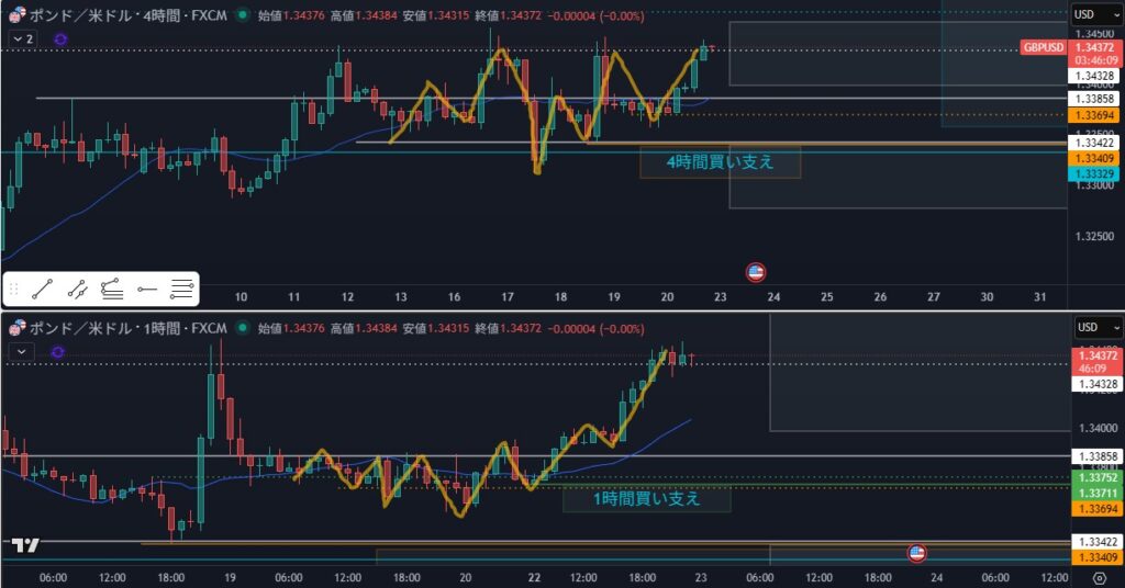 狙うにしても4時間の買い支えを抜けたかどうかの判断が難しい場面、まずは1時間のトレンドフォローから狙っていきたい