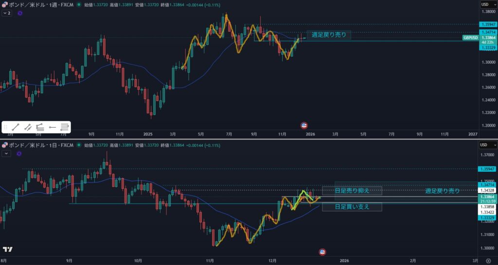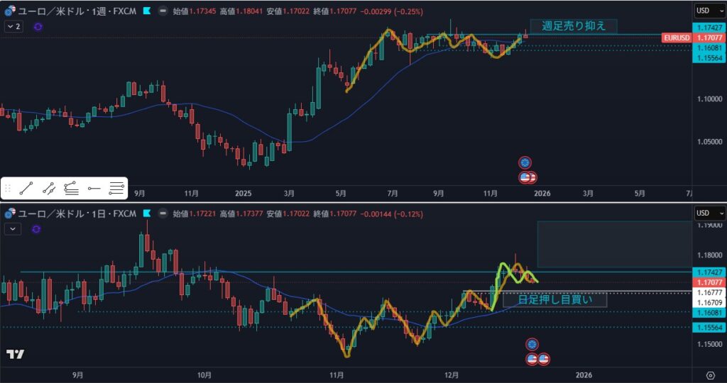 週足が安値を作った、これは下落転換しやすくなったとも言える。日足の以前の高値をしっかり越えらるかがカギになりそう。