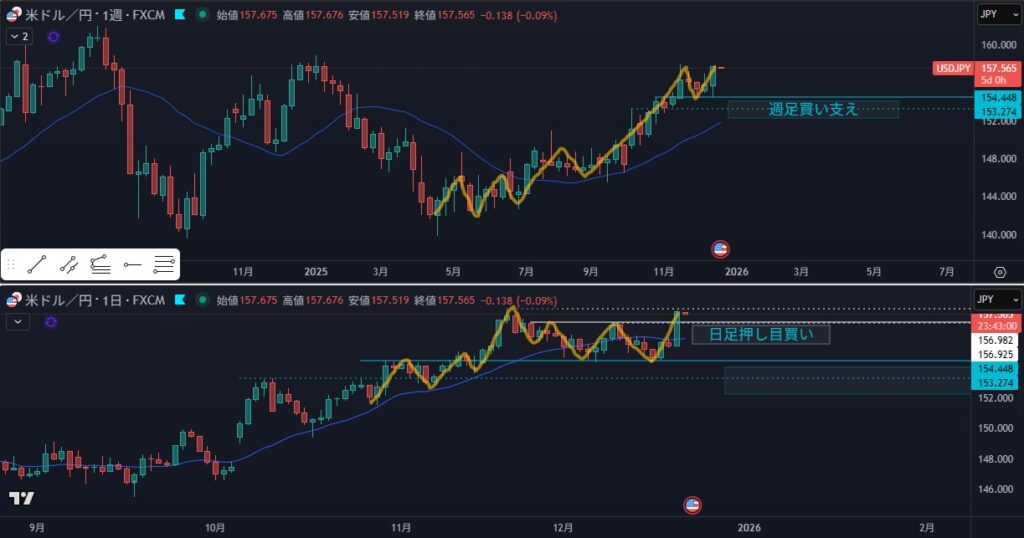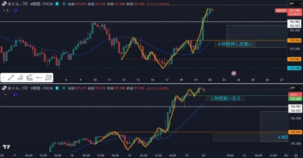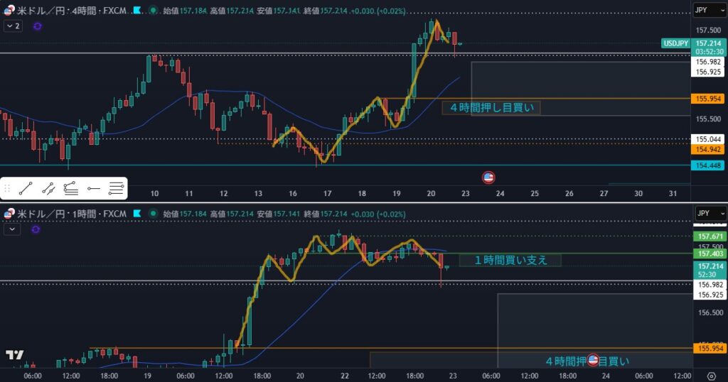 - 4時間の買い支えラインでレジサポして、トレンドフォローが狙えるなら試したい