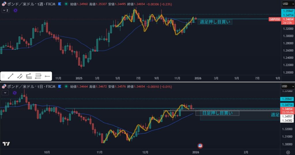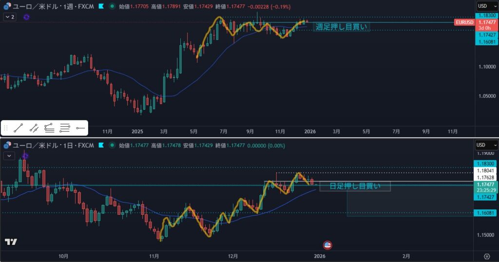 - 週足の押し目買いラインまで押してきたが、週足は抜けが微妙で狙えない
