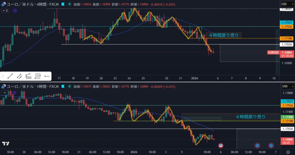 - まだ4時間が確定していないが、前回安値を抜けて下落中に見える