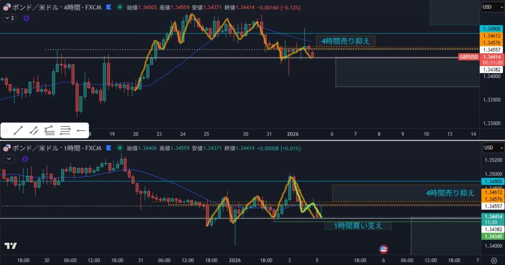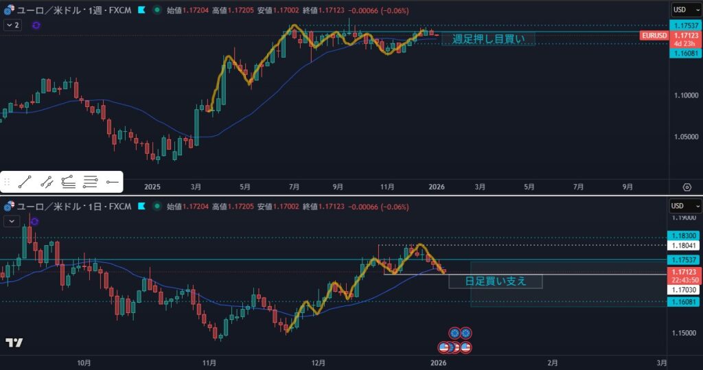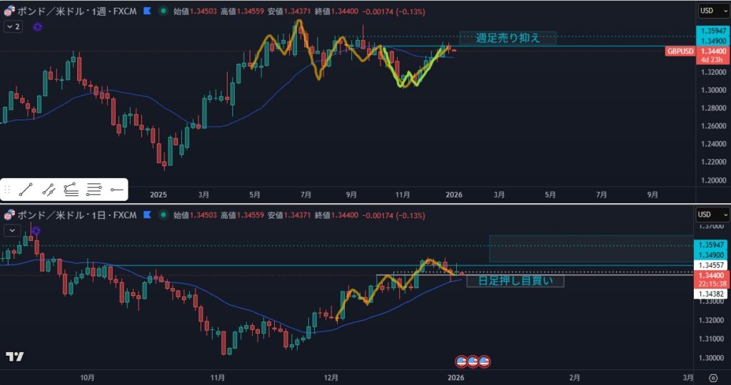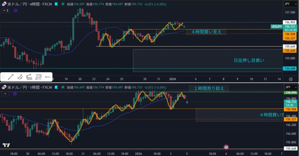 - 売り抑えがいるエリア、日足の買いは考えず下位足のトレンドフォローを待ちたい