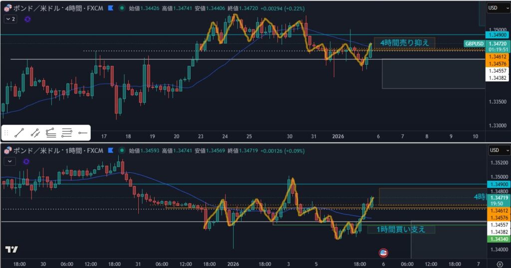 - 日足の売り抑えと4時間の買い支えに挟まれている