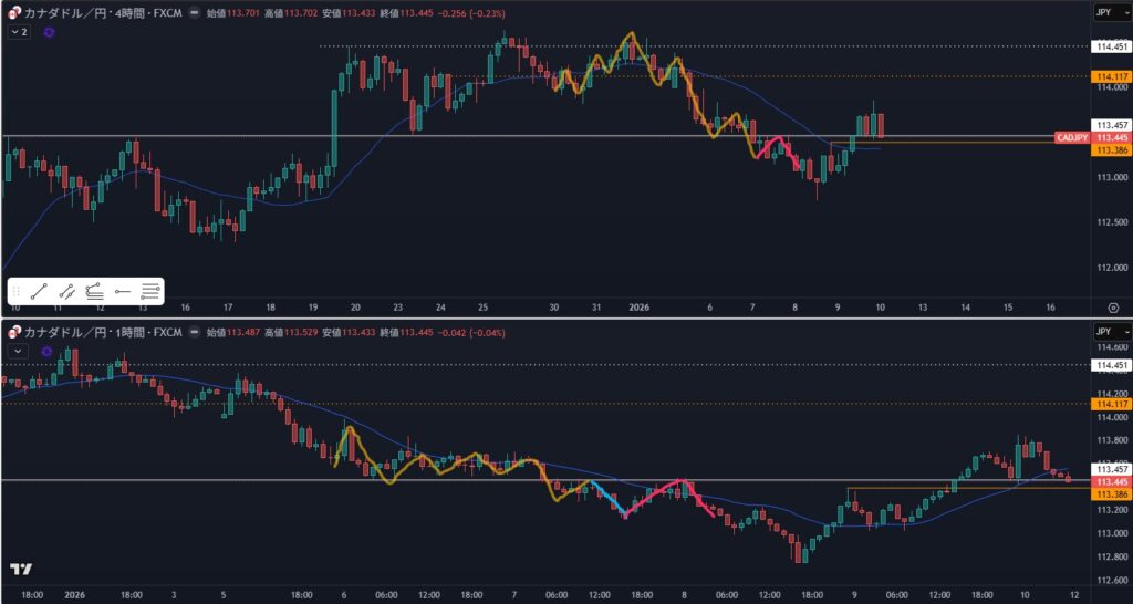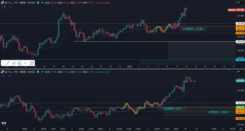 4時間の押し目買いにもなってるけど、4時間高値超えブレイクは難しい、入りにくい