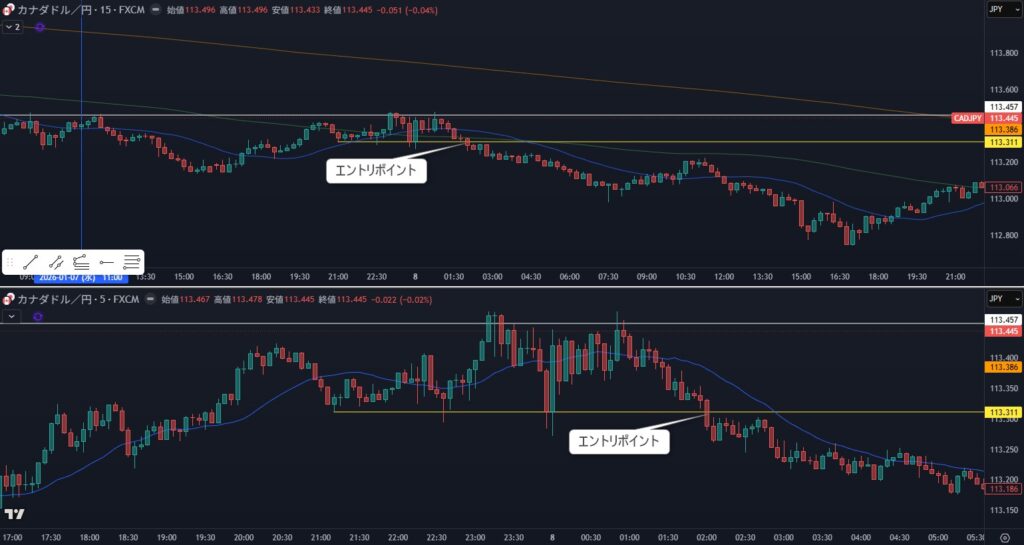 5分足を見ると乱高下しているようにも見えるけど、エントリポイント付近では落ち着いた動きなので入れたんじゃないかと思う。