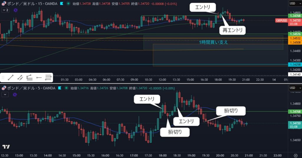 - 1時間の押し目買いにも見えるが、エントリポイントが4時間の高値越えになってしまう。リスクが高い
