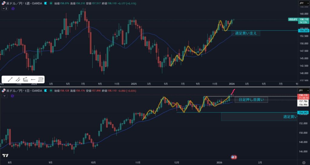 - 押し目買いを見ていく、日足の戻り売りラインまで