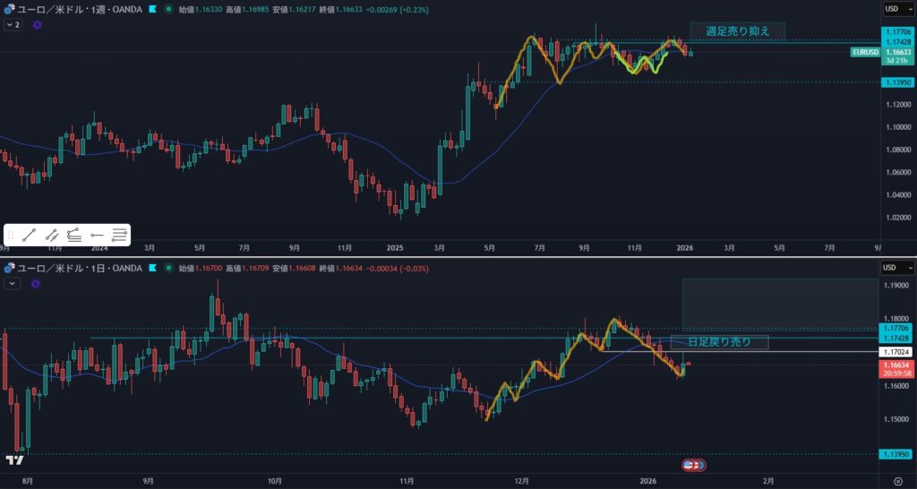 - 前回高値を抜けたかどうか微妙なところ、週足は節目が分かりにくく方向感がつかめない