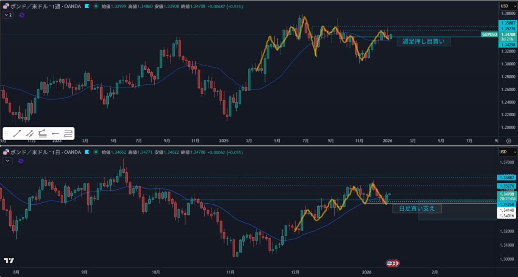 - 押し目買いを見ていく、日足の戻り売りラインまで