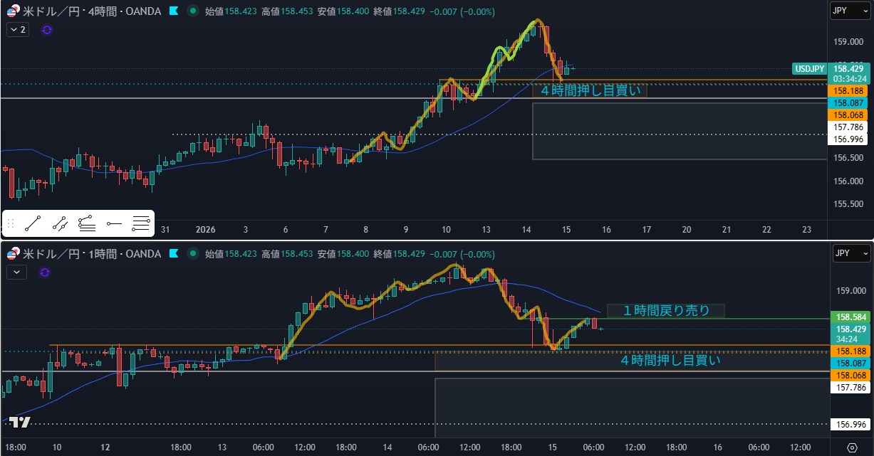 - 4時間の戻り売りが入ったようにみえるが、4時間が確定するまでわからない