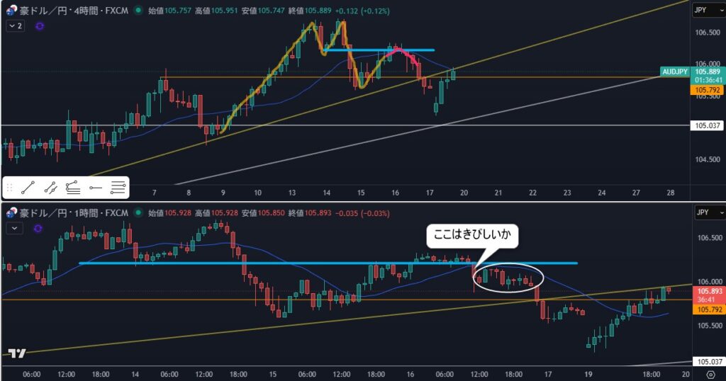 4時間レベルでMAが支えてくるかもと考えるとエントリはきびしいか