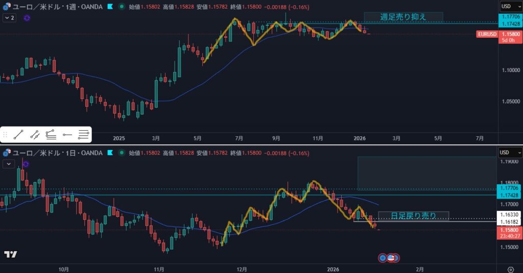 - 戻り売りを狙う場面だが、日足の押し目買いがあり狙えない