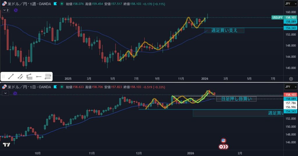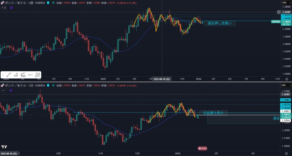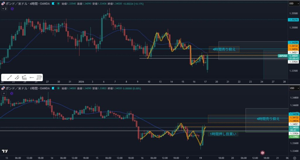 - リスク:日足押し目買いと4時間戻り売り&週足売り抑えでの戦争になりやすい