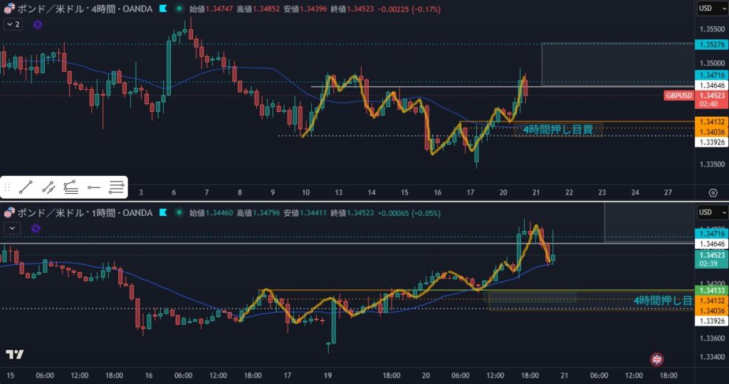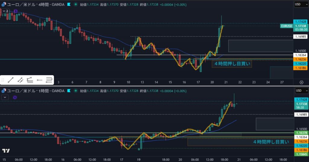 - 4時間押し目買いを狙うがMAがまだ下を向いている
