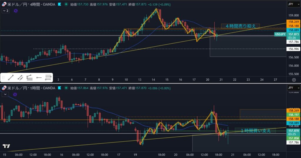 - 4時間全戻しから売りを考える場面だが、日足の押し目買いに挟まれている
