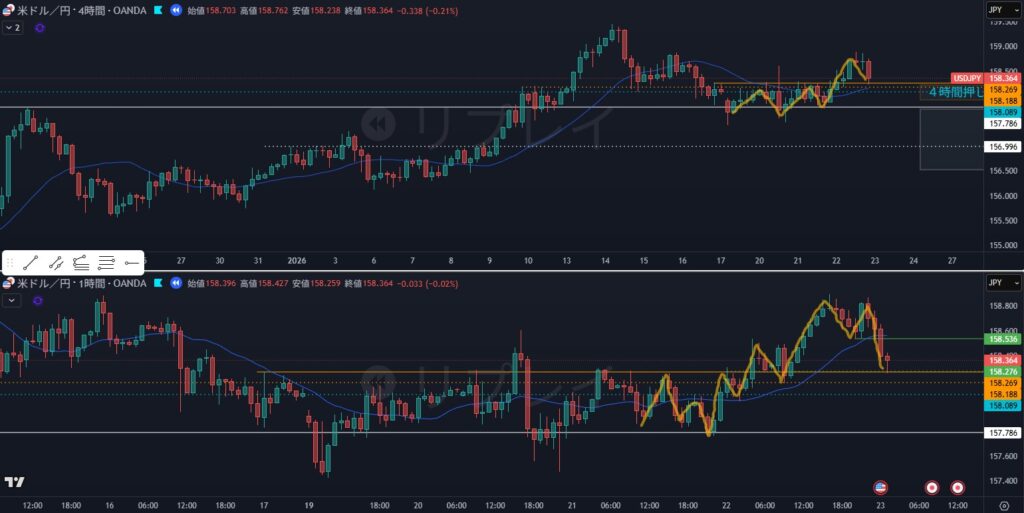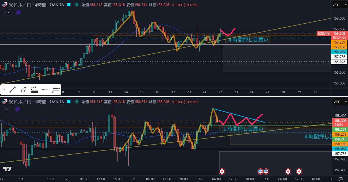 4時間が転換してエントリポイントになりそうな場面で、1時間の押し目買いが狙えるならそこから入る。そうすれば4時間がヒゲで戻されずに転換する可能性が高い