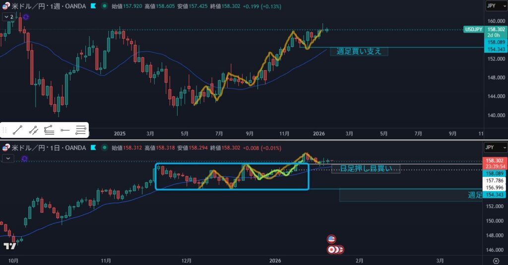おそらくここから上はずっと何かしら売り抑えがいる可能性がある、月足高値圏や介入警戒など