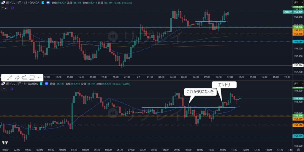 今見たら水色ラインがエントリポイントだとわかるけど、この時はどこ抜けたらエントリなんだろ?これホントに波出るか?って不安になって、エントリが遅れた。