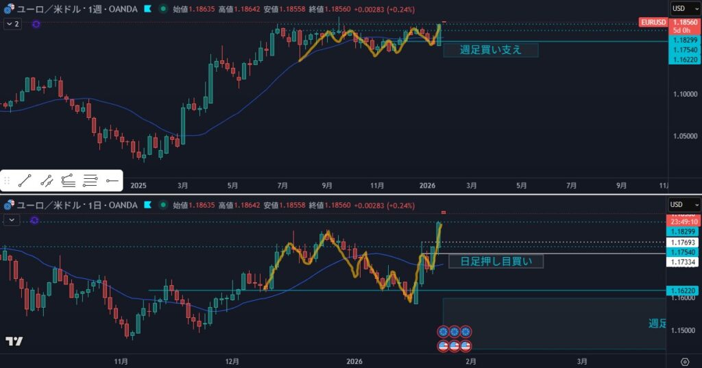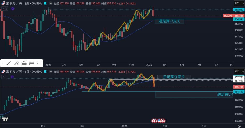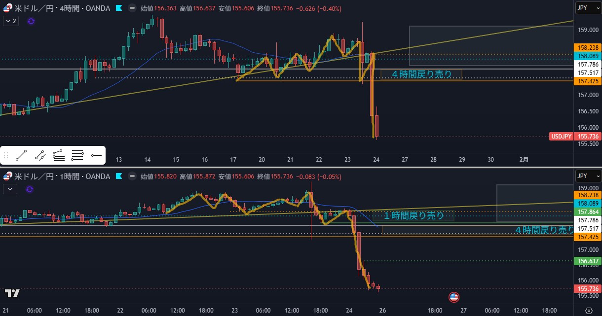 ①1/6 5分ダウ崩れで決済、崩れずに伸びた場合は目標価格到達で決済