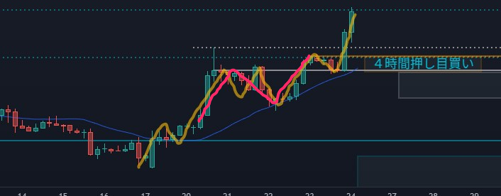4時間伸び切りにも見えるが、まだMAの確度が衰えていない状態で、1時間の押し目買いが狙える場面