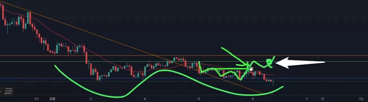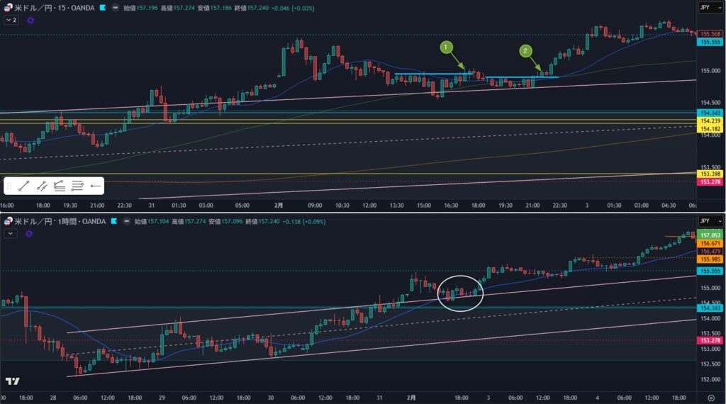 今見ると①で入って抜けるのを試すが一番入れそうかな、2はたぶん無理、下げて①でレジサポするの待ちたい。③は5分で見ると小さく抜けたよね確認してて入れそうだけど、ここも下げてレジサポを待ちたくなる、一気に抜けすぎてて。