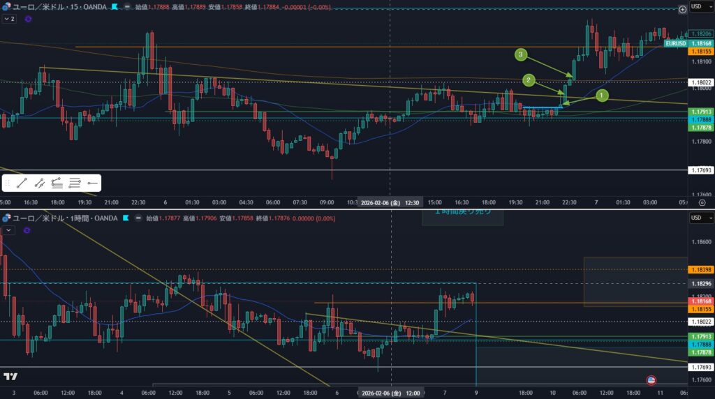 金曜のユロドル。上15分下1時間