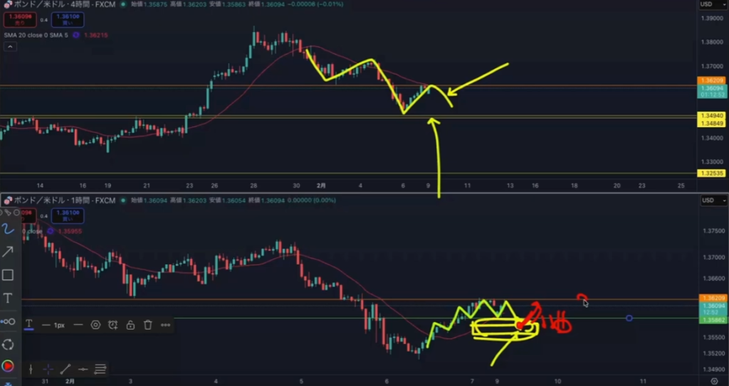 上4時間下1時間。4時間でこのダウカウントをすると、1時間の安値割れがエントリポイントになるが、ダウカウントが違った場合、逆行逆行で連敗することになる