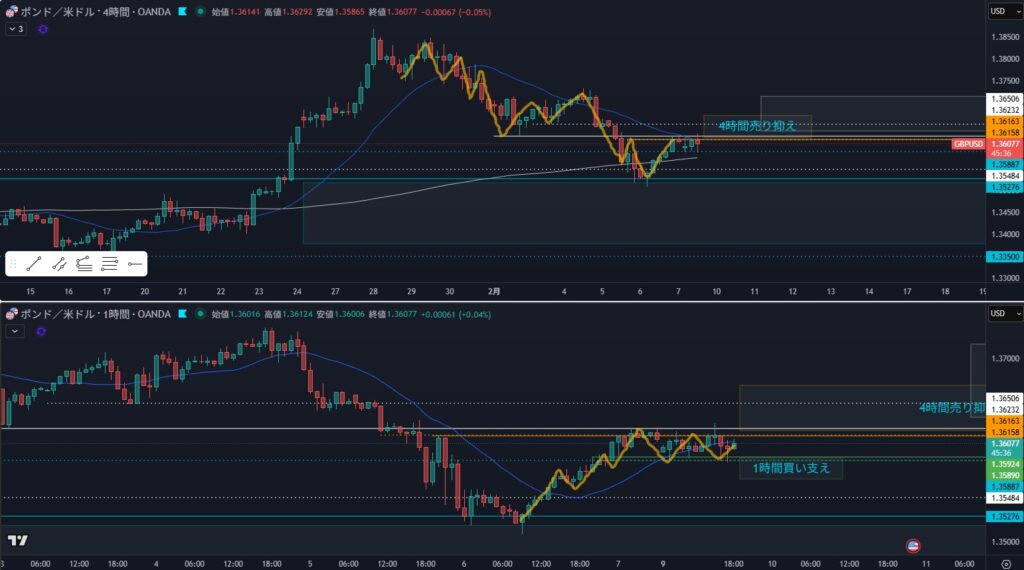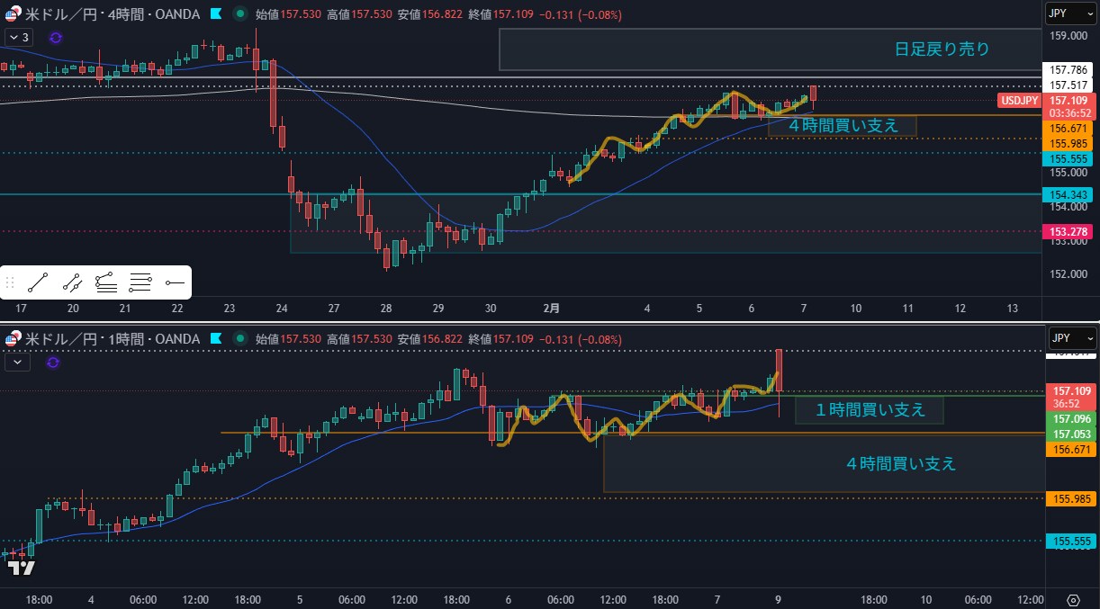 流れ的にも4時間のMAに乗っかった感じも買いだとは思うけど、エントリが難しい印象
