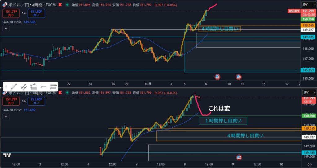 4時間は軸足として上記に加え違和感や他の見方はないか、斜めライン、リスクも意識する