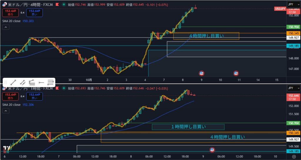 - 上昇波の途中なので買い目線で4時間を見る