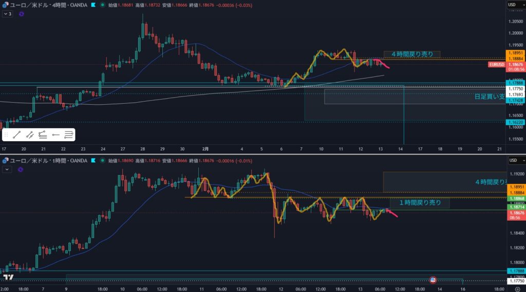- リスク:4時間伸び切りリスク、日足前回安値付近