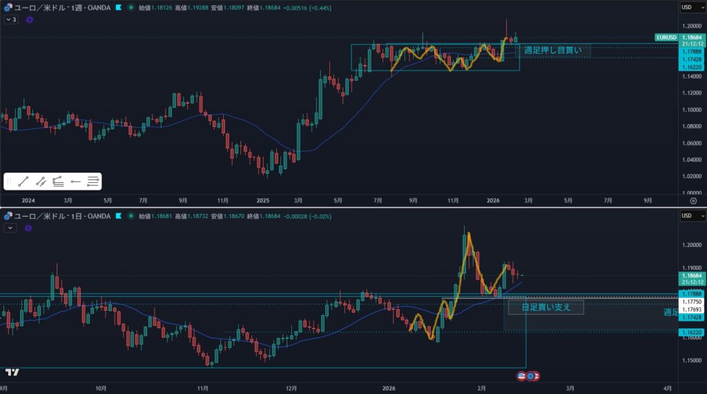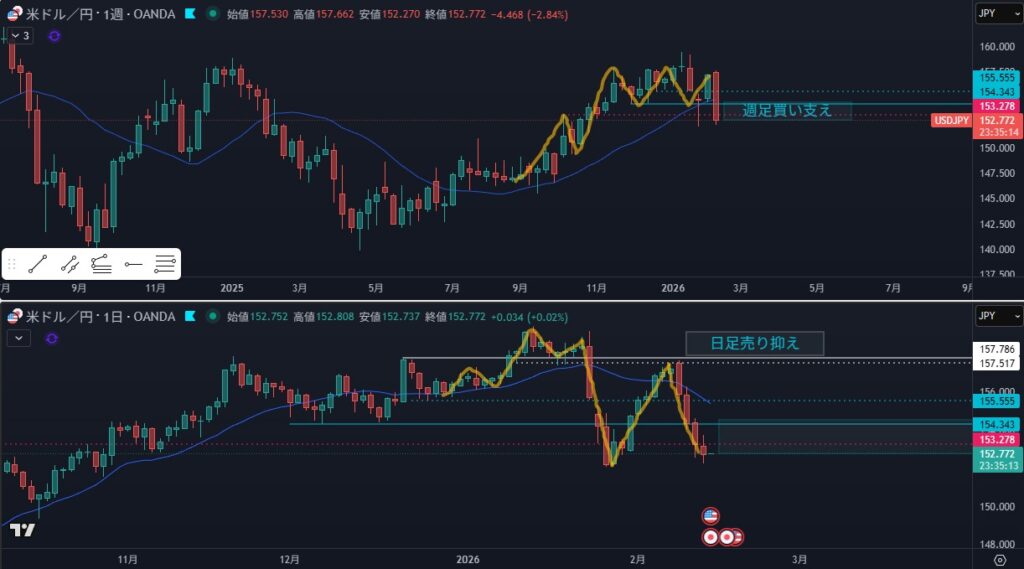 日足のMAがとにかく邪魔、日足レベルで支えてこられたら抜けたかどうかの判断が出来ない
