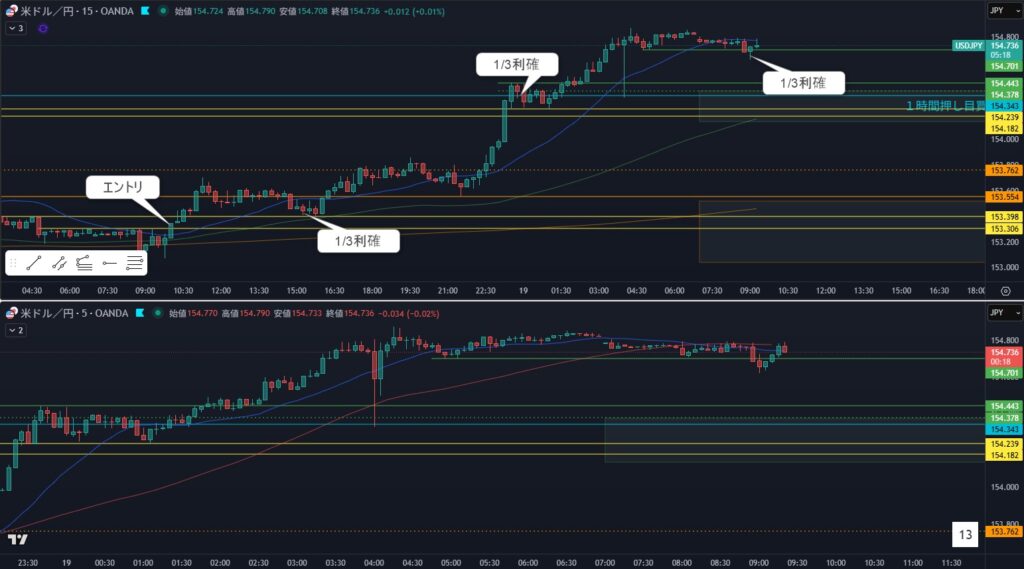 - 狙い:1時間押し目買い、エントリ中