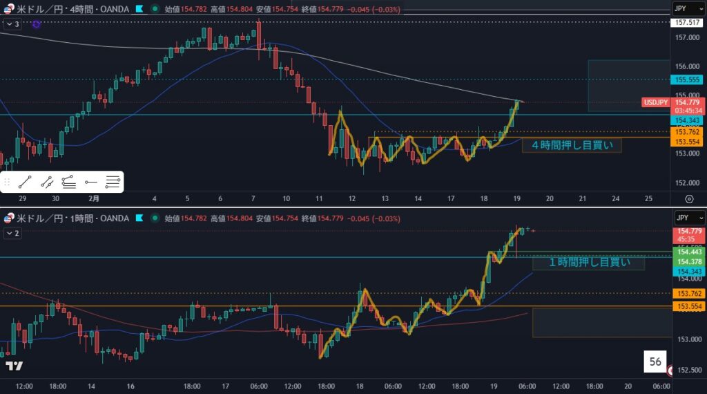 - 1時間押し目買いでエントリ中