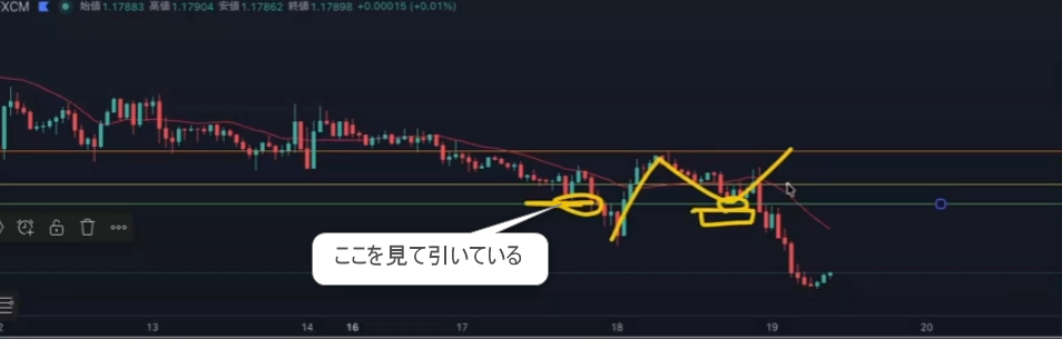 1時間足。全戻しから押し目買いが入りやすいラインを引いておく。結果押し目買いが入らずに下落していった、行っちゃったなぁっでOK