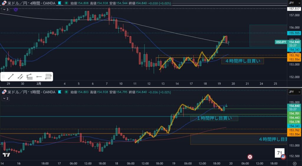- 買い目線で4時間のトレンドフォローを待つ
