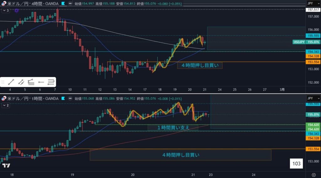 - 4時間の押し目買いが狙える形ではない