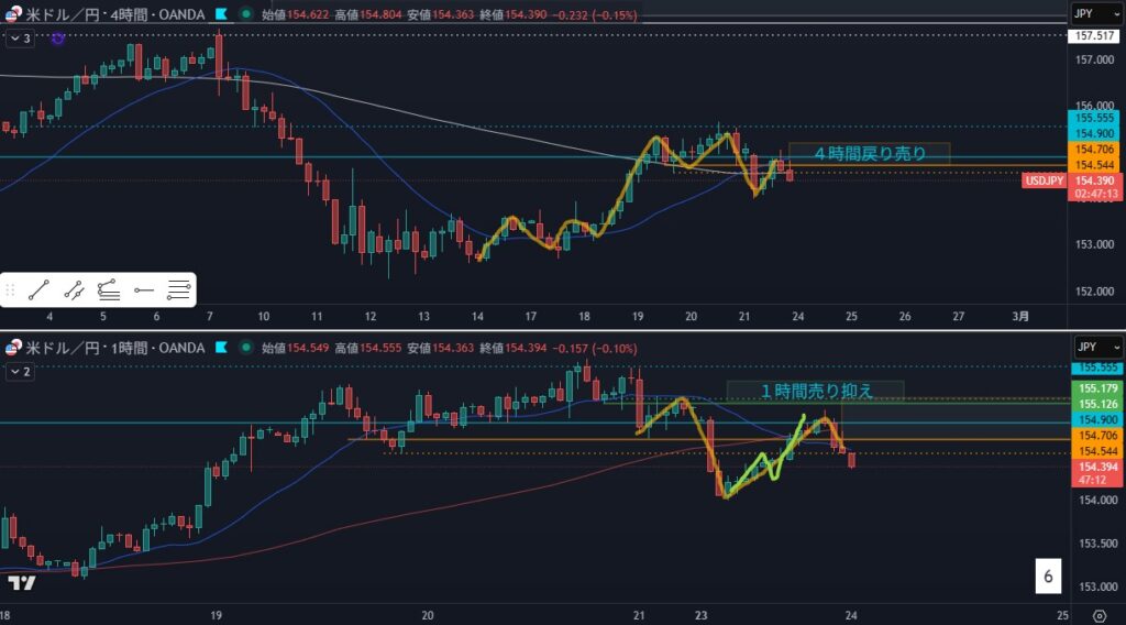 1時間の戻り売りが入ってるように見える。4時間の戻り売りにしては早い