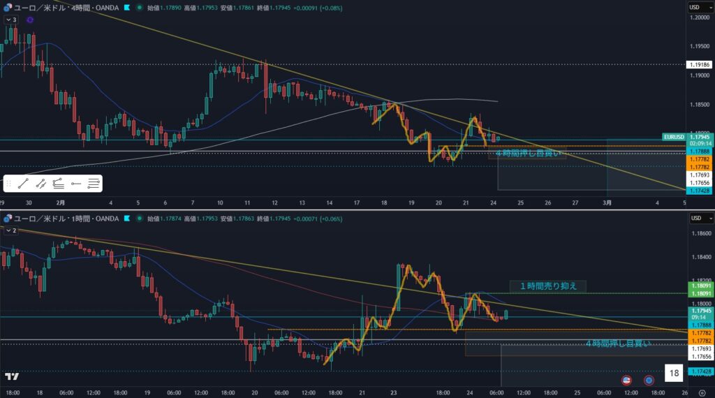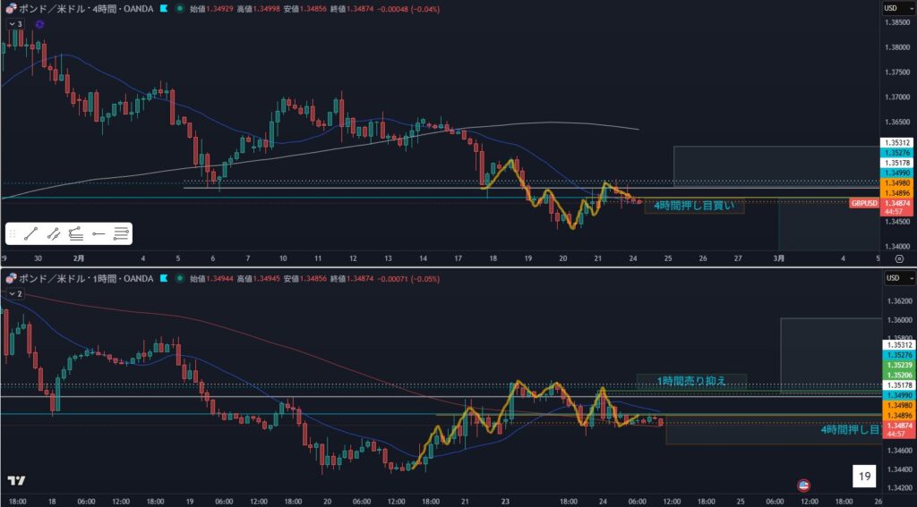 - 4時間押し目買い狙い、1時間の転換を待つ