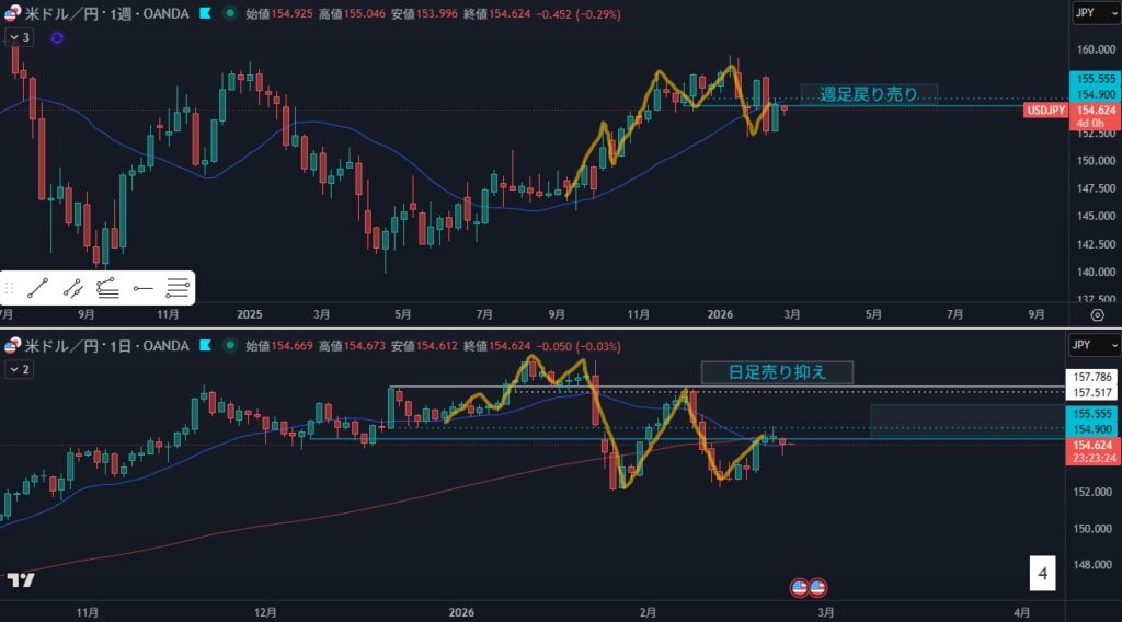 - 週の戻り売りラインと日足のMAに挟まれている
