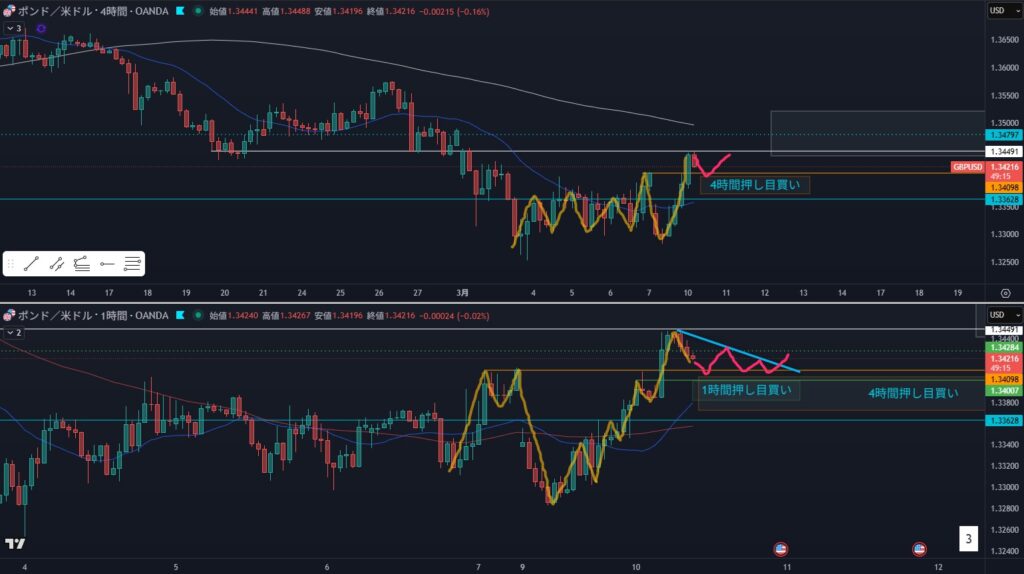 - 狙い:4時間の押し目買いの押しを待つ