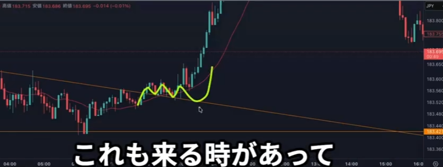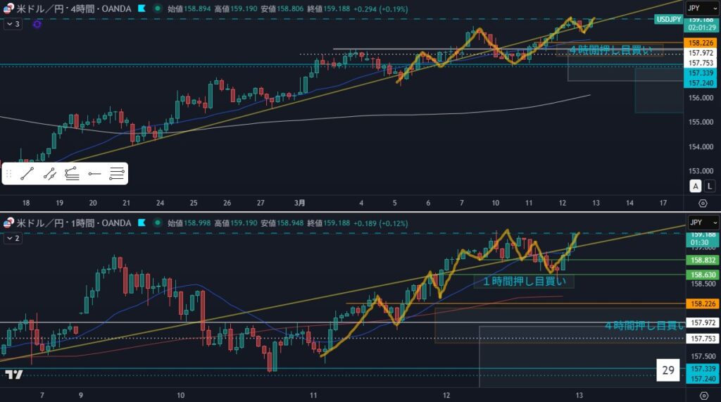 - 狙い:1時間押し目買いの押し待ち