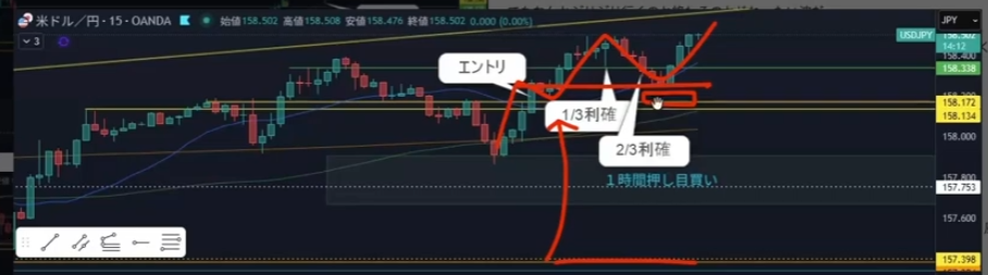 抜けるのを試すロットをどれくらい残すかを考えていたと思う。4時間が止めてきそうなラインが見えてて、その辺でおおかた決済してしまうか残して耐えるかを考えていた。今の考えはラインが見えてるならおおかた決済してしまって、残り20%くらいは抜けらたラッキーで持っておけば良かったかなって思う。