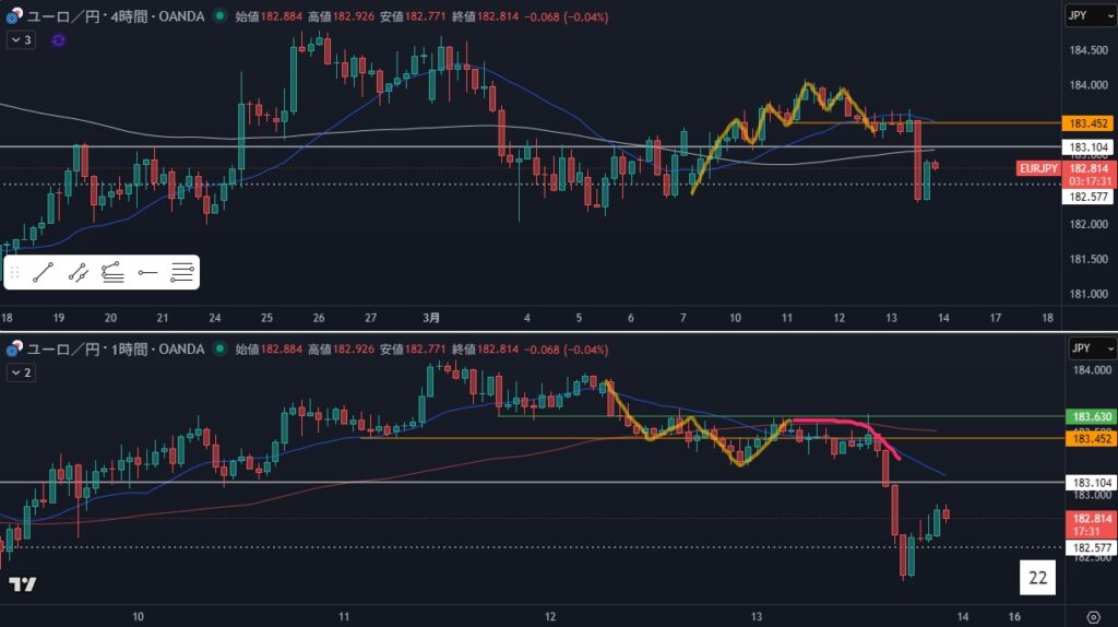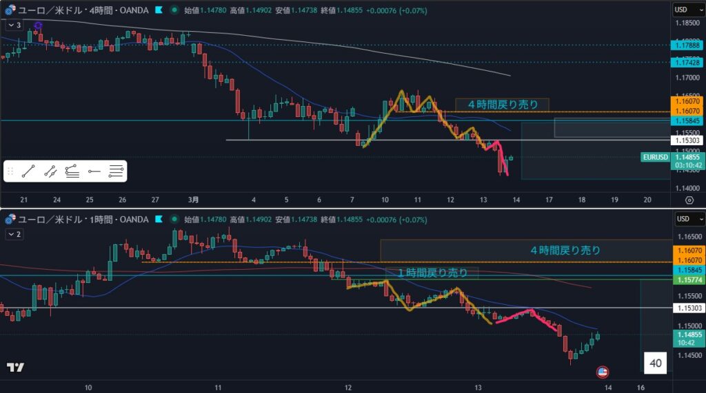 4時間が転換シグナル出た後の1時間全戻しからの売り