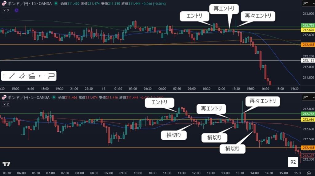 13:20 5分ですら抜けてなくて逆行して損切り-10pips