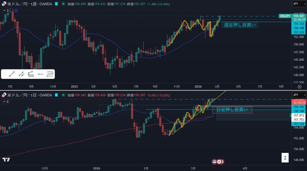 - 狙い:4時間、1時間の押し目買い