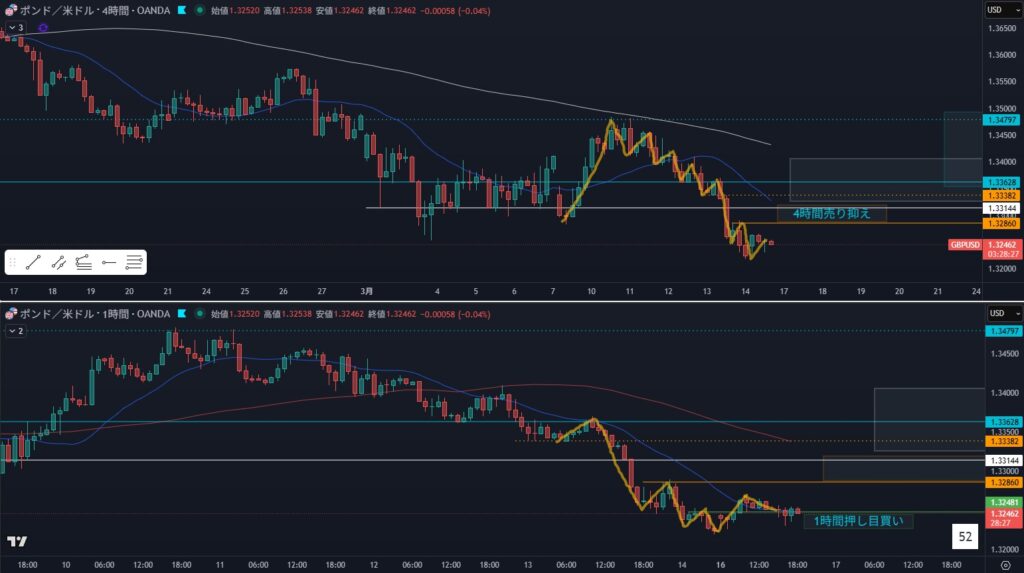 • 狙うなら1時間の戻り売りか?更新幅が狭く懐疑的に見てしまう