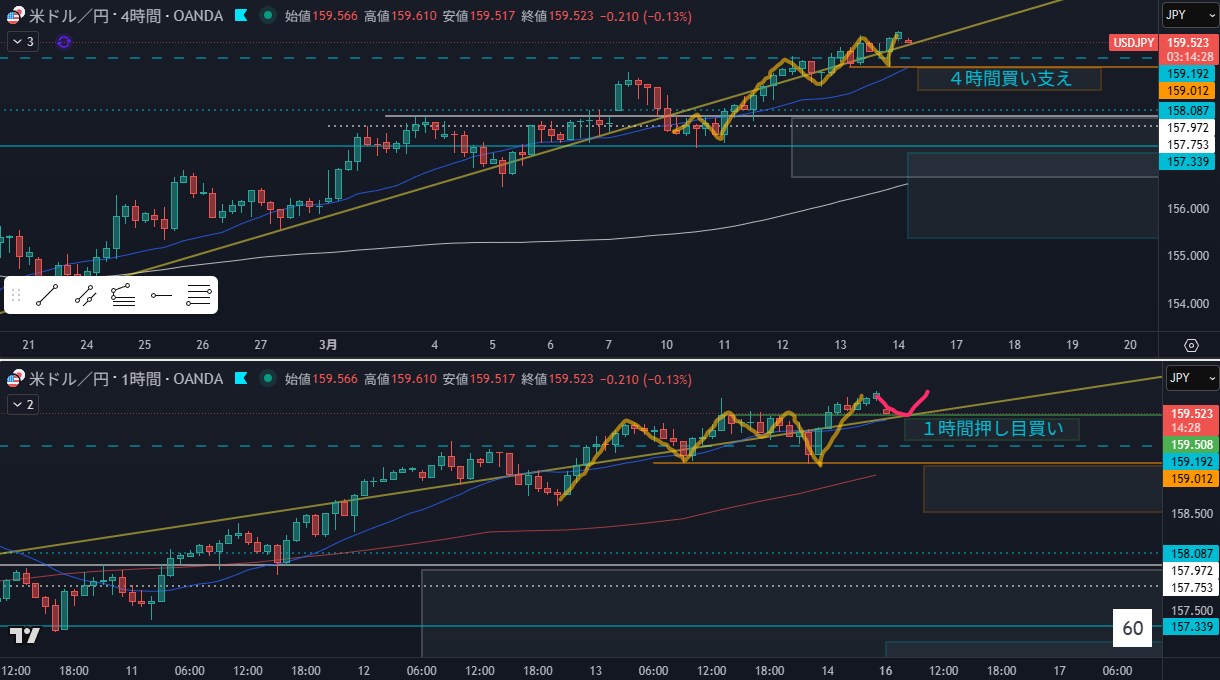 • 狙い:1時間の押し目買い