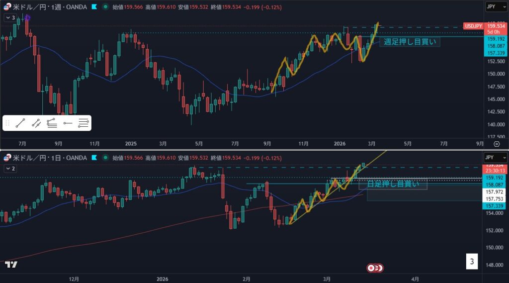 • 緑ラインの下に押し目買い勢力